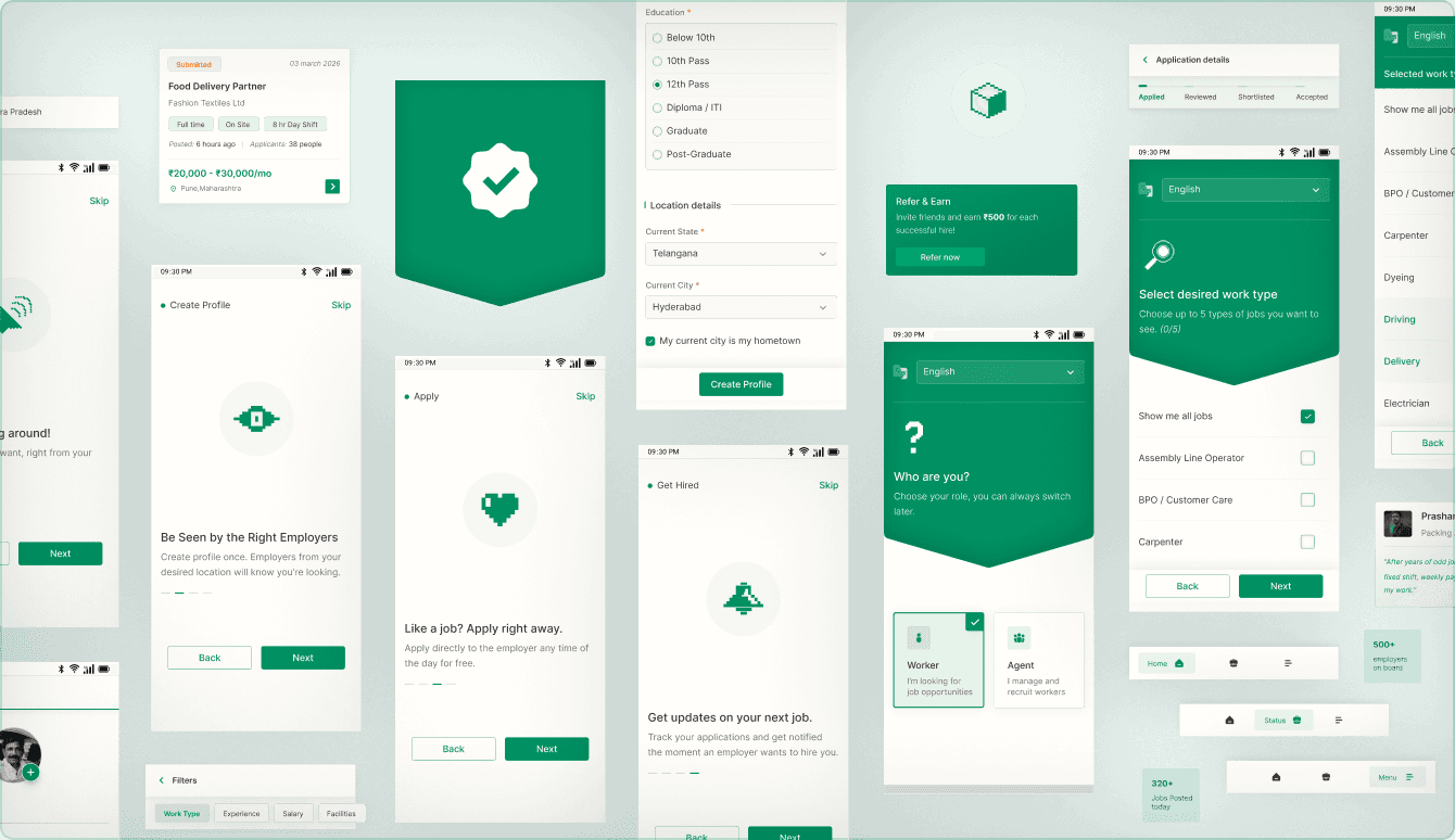 I proposed a trust-first redesign that offers value before sign-up, clearer job details, guided profile setup, and transparent application tracking