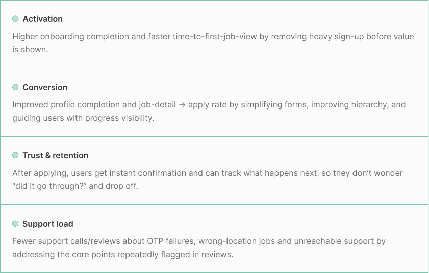 This redesign is built to convert downloads into outcomes by fixing the biggest funnel leaks: value shown too late, login friction, unclear discovery, and a post-apply “black hole” that breaks trust. By making the journey feel reliable (install → find → apply → track), we expect more users to stay active, complete profiles and apply with confidence that results in more placeable workers and ultimately more placements.