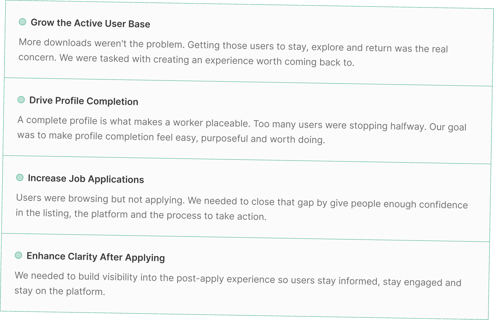 It was to identify where users were dropping off and fix the specific moments so people can go from installing the application to getting a job offer.