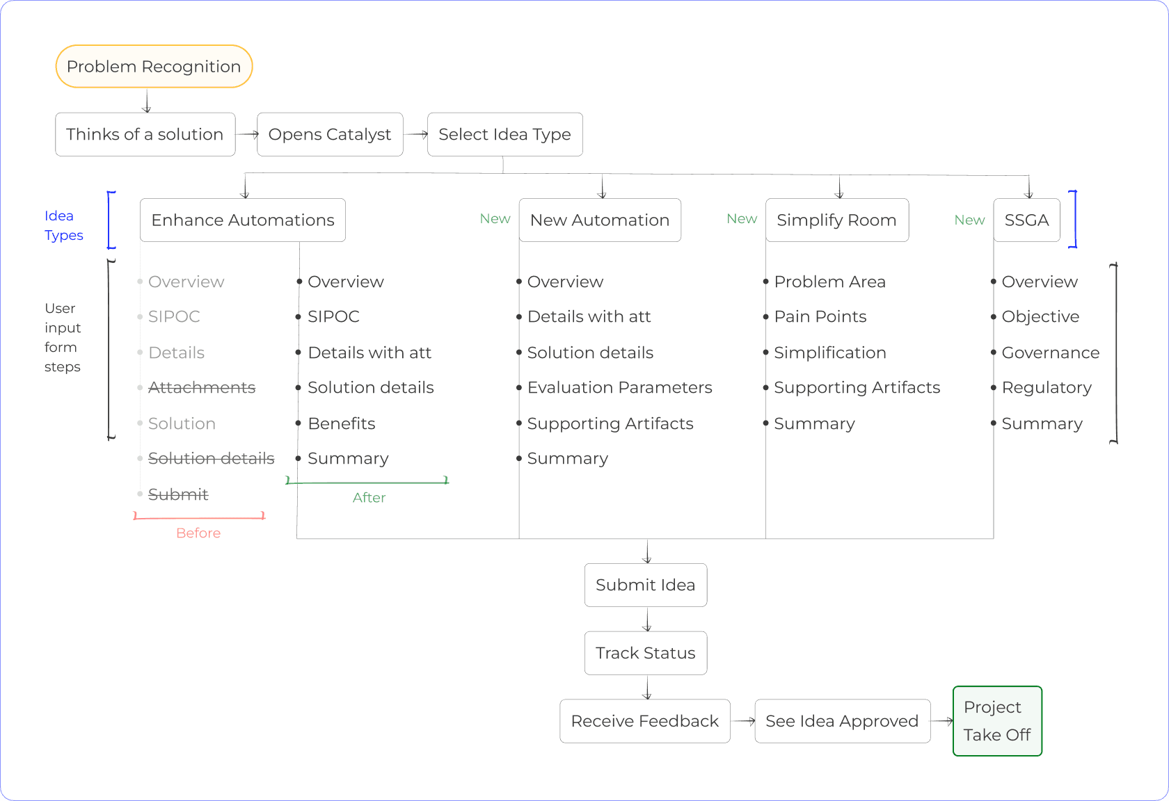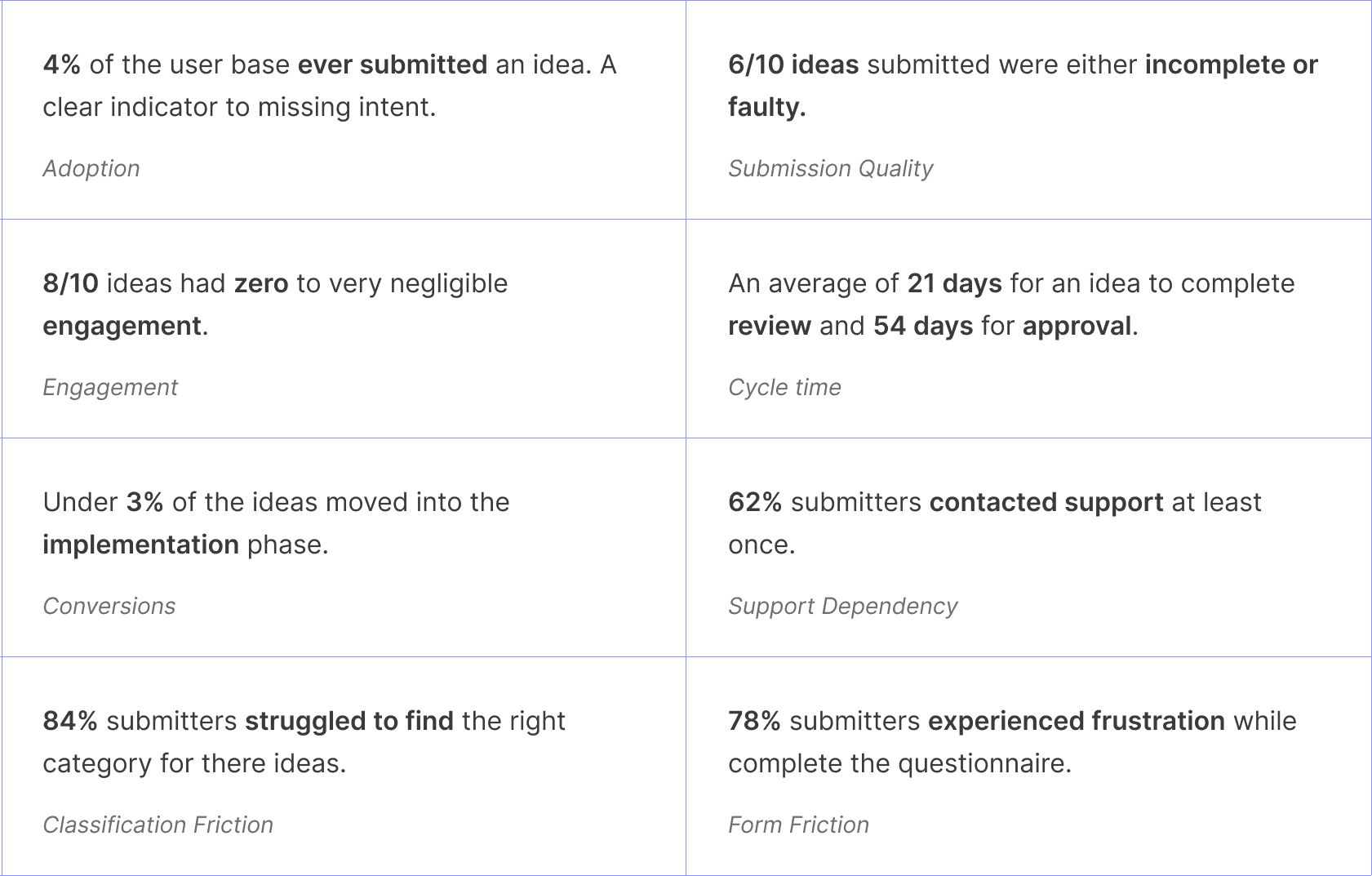 Started with a quick audit on existing idea management portals (IMPs), respective work flows, existing idea submissions, through review of platform data and also through conversing with submitters, reviewers and support team we were able to understand the short falls and uncovered the challenges pointing to: