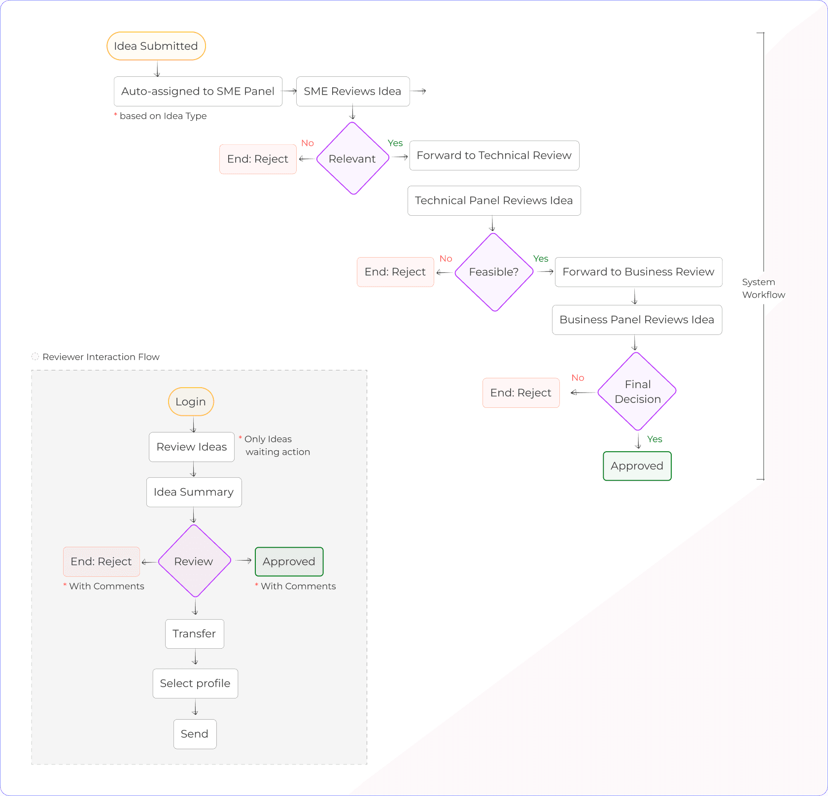 The below workflow diagram visualises the path of a submitted idea from the initial submission to a final decision. Showing, how it is reviewed and refined along the way.