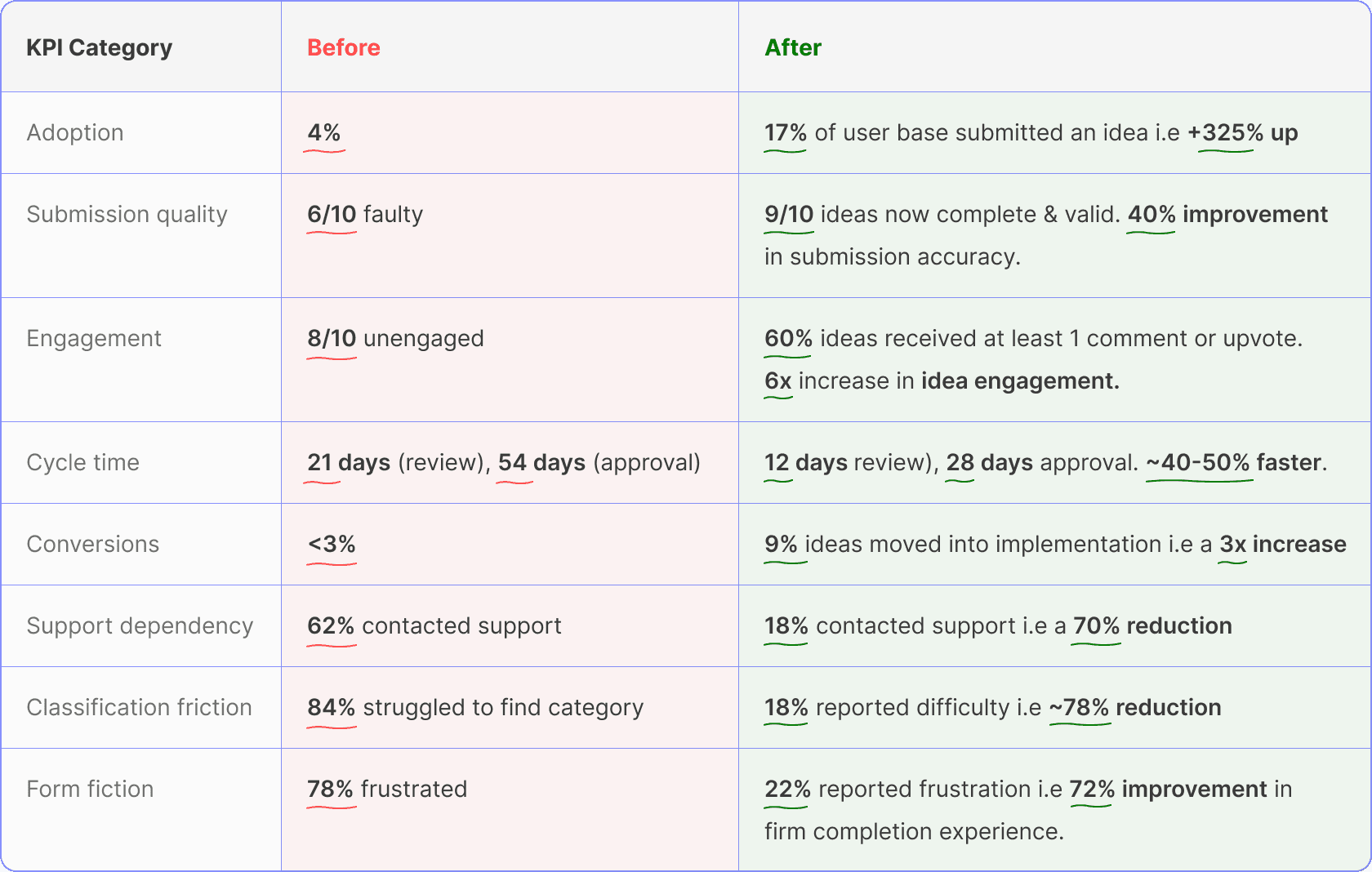 The redesign had demonstrated measurable improvements across all performance indicators validating the effectiveness of design lead interventions.